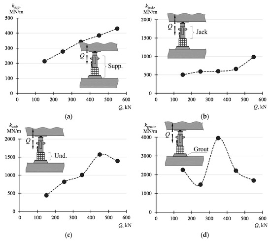 The influence of the value of the force Q on the support parameters was then analyzed. For this purpose, the displacement values corresponding to the force Q of 100 kN, 200 kN, 300 kN, 400 kN, 500 kN, and 600 kN were read from a load curve of 100–600 kN. Displacement increments (Δlsup, Δljack, Δlund, Δlgrout), corresponding to increments ΔQ of the force, were determined on such basis for the ranges of 100–200 kN, 200–300 kN, 300–400 kN, 400–500 kN, and 500–600 kN. For these ranges, the stiffnesses ksup, kjack, kund and kgrout were determined according to the dependency (8) and (9). The determined displacement and stiffness values are listed in Table 4. The values are presented graphically in Figure 13.