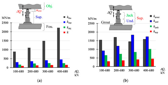 Stiffnesses corresponding to the change ΔQ in the range of Qmin–Qmax: (a) kfou, ksup, kobj, k, (b) kgrout, kund, kjack, ksup.