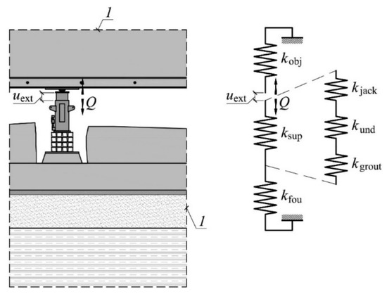 The pistons of the jacks were extended while removing the deflection. The support, in which the piston extension (uext) was forced in the given cycle, was called an active support (Figure 2). There was an increase in the value of the force (Q) in this support. Moreover, in the place where the active support was installed, there was an upward movement of the elevated part of the building (uobj) and a slight downward movement of the part remaining in the ground (ufou). Moreover, as the support force was rising, the support was shortened (Δlsup). The support in which no piston extension was forced, was called a passive support. In the process of uneven lifting, depending on the lifting phase, the given support can be either active or passive.