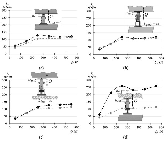 However, assuming that the supports rest on an undeformable substrate (kfou = ∞; Figure 17c), the stiffness of the system increases by 10%–35% depending on the force Q.