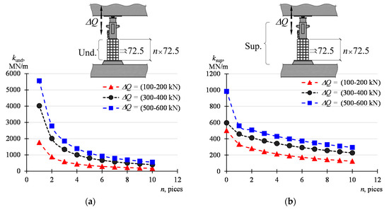 The stack in the investigations consisted of four parallelepiped elements, 72.5 mm long each. Hence, the stack length was 290 mm. The results obtained can be generalized into stacks consisting of a different number of elements. Table 6 compiles the calculated stiffnesses kund corresponding to the stacks the part of which is n = 1, …, 10 elements, considering that the elements of the stack are connected in series. The stiffnesses kund, as load-dependent values, are shown in Figure 18a. In turn, Table 7 and Figure 18b show the stiffnesses ksup calculated according to (12). The case for n = 0 corresponds to the situation where the support consists only of grout and a jack. Within the investigated range, the stiffness of the support may vary from 124 MN/m (n = 10, ΔQ = 100–200 kN) to 985 MN/m (n = 0, ΔQ = 500–600 kN).