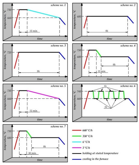 Time vs. temperature schemes of the annealing process.