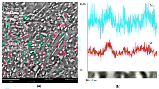 Microstructure of 42CrMo4 steel annealed according to scheme no. 4 (a), (b) molybdenum and chromium content in the line-scanned area from (a), scanning electron microscopy-energy dispersive spectrometer (SEM-EDS).