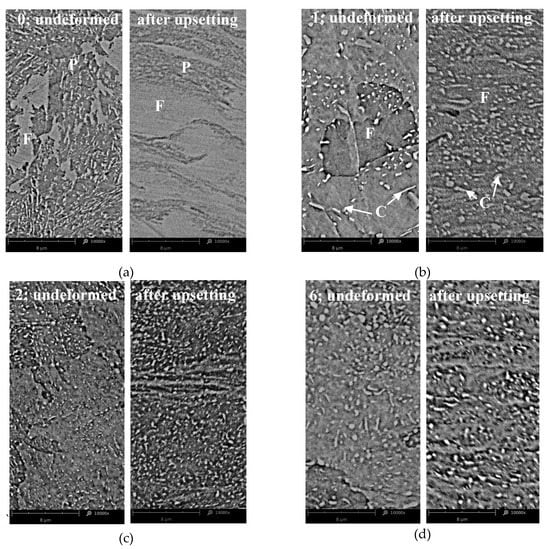 Effect of upsetting on the microstructure of 42CrMo4 steel samples: (a) as-received, (b) annealed according to scheme no. 1; (c) annealed according to scheme no. 2; (d) annealed according to scheme no. 6; P—pearlite, F—ferrite, C—cementite, SEM.