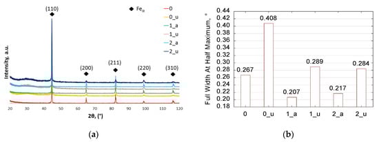 X-ray diffraction phase analysis of 42CrMo4 steel; (a) phase composition after annealing and upsetting; (b) quantitative microstructure phase analysis of an approximately 44° peak in the [110] plane; samples: 0—as-received; 1_a and 2_a—annealed; and 0_u, 1_u, and 2_u—upsetting; XRD.