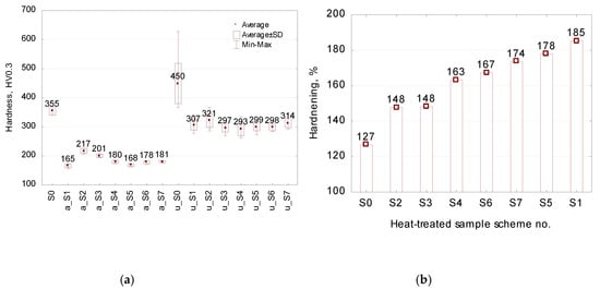 Hardness results of S0–S7 samples: (a) microhardness before and after upsetting (marked as “a” and “u”); (b) rate of cold hardening due to upsetting.
