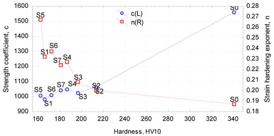 Additionally, many researchers have stressed the importance of calculating strain-hardening coefficients such as a strength coefficient, c, and a strain-hardening exponent, n. They are particularly essential when selecting heat treatment technological parameters or elaborating metal forming technology for steel [,], aluminium alloys [,], magnesium alloys [,], pure copper [], powder metallurgy materials [,], or plasticine [,], or even MMC (metal matrix composite) materials [,]. Therefore, this paper investigates the effect of annealing on the strain-hardening parameters, and the c and n coefficients are determined and can be used in numerical simulations and experimental tests of 42CrMo4 steel components dedicated for metal forming [,].