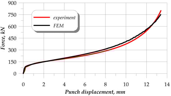 The determined flow curves were used in the numerical simulation of the upsetting of cylindrical samples, with the simulation conditions reflecting the experimental ones. The quality of the numerical results was assessed based on the force parameters. Figure 12 shows the force during the upsetting of samples that were annealed according to scheme no. 3, which is, as already mentioned, an intermediate scheme between extreme schemes no. 1 and 2. The experimental and FEM results show very high quantitative and qualitative agreement. In effect, the determined constitutive equations reflect well the real conditions.