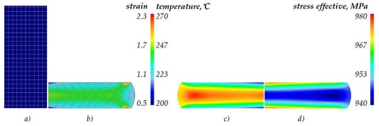 Numerical results of the upsetting process (half-view of the axial section): (a) start of the process, (b) effective strain, (c) temperature, (d) effective stress.