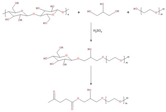 Three bio-based polyols were synthesized by the liquefaction process of shredded cellulose. PEG 400 and refined crude glycerol were used as a solvent in this reaction. As a catalyst, 95% water solution of sulfuric acid was used. The mass ratio of cellulose to the solvent was 1:10. The catalyst (3 wt.%) was added to the reactor to accelerate the process. The reaction was run for 6 h at 120 °C, 150 °C, and 180 °C to determine the impact of temperature on the reaction. Samples were collected every hour. After this process, the obtained polyol was neutralized with sodium hydroxide pellets and dried under vacuum for 2 h. Figure 1 shows the main cellulose liquefaction reaction. Polyol with the best properties (appropriate hydroxyl number, biomass conversion, viscosity, and water content) was selected for further research.