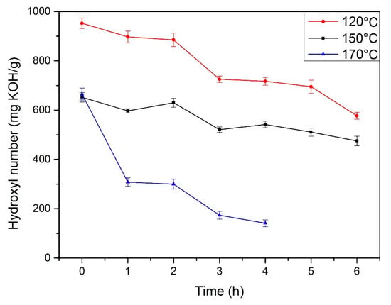 The variation of the hydroxyl number over time is presented in Figure 2. The reaction at 170 °C was carried out only for 4 hours because of the high viscosity of the system. For the temperature of 120 °C and reaction time 6 h, the hydroxyl number of bio-based polyol was about 600 mg KOH/g. For polyol synthesized at 150 °C, the hydroxyl number of was 475 mg KOH/g, which is comparable to the commercially available polyols.