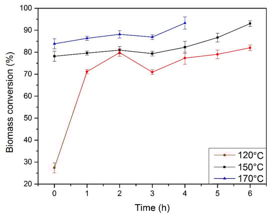 The fastest biomass conversion was observed for the temperature of 170 °C; however, the too high viscosity of the system does not allow its use in further researches. At 120 °C, a satisfactory level of conversion was not achieved, which resulted in the products obtained having inferior properties. The best properties (low water content, suitable viscosity, and high biomass conversion) were obtained for a reaction temperature of 150 °C and a reaction time of 6 h.