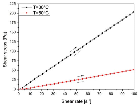The results show that obtained bio-based polyol shows the linear flow and can be described as a Newtonian fluid. According to obtain the curves (Figure 4.), it was noticed that shear stress decreases with increasing temperature. This effect is caused by the higher mobility of macromolecules and free volume between them. The maximum value of shear stress was 198.6 Pa and it was observed at 30 °C. This parameter decreased to 52.2 Pa when the temperature was raised to 50 °C. The bio-polyol obtained in the liquefaction process is a rheologically stable fluid because the deviation of the flow curve hysteresis is small.