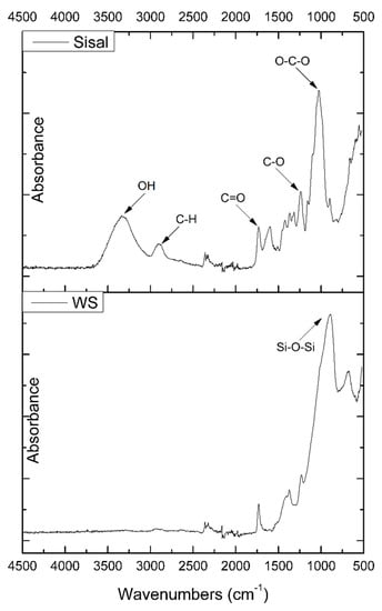 Figure 6 shows the FTIR spectra of glass and sisal fibers. For the sisal fiber, the peak near 3300 cm−1 confirms that hydroxyl groups (OH) are present in the sisal fiber. Due to the presence of these groups in the structure of sisal fiber, it can be considered as a reactive filler. The OH groups in the fibers can absorb moisture and form a weak interface when incorporated into a polymer matrix. The vibrations near 1730 cm−1 and 1250 cm−1 can be associated with C=O and C–O bonds in cellulose, lignin, and hemicelluloses, which are present in the sisal fiber structure. In addition, a C–H vibration peak at 2910 cm−1 can be observed. The signal near 1410 cm−1 can be related to the stretching of the CH2 groups [,,,,] For the glass fiber, the most important peak occurs about 900 cm−1 and can be related to the Si–O–Si bonding.
