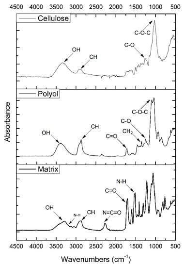 Figure 7 shows FT-IR spectra of cellulose (biomass), polyol, and matrix. For the polyol the characteristic OH-stretching vibrations band is visible at 3400–3300 cm−1. The band visible at 2950–2860 cm−1 can be assigned to symmetrical and asymmetrical CH-stretching vibrations originating from the CH2 groups present in aliphatic chains, or the CH3 groups. The band at 1720 cm−1 can be related to CO-stretching vibrations in cellulose or to the vibrations caused by carbonyls generated during cellulose degradation at high temperatures. The absorption bands at 1440–1340 cm−1 have been assigned to CH2 and HOC in-plane bending vibrations in cellulose resulting from aromatic skeletal vibrations combined with a symmetrical mode of bending hydroxymethyl. The signal at 1210 cm−1 can be attributed to C–O and C=O-stretching vibrations. The characteristic for the ether group vibrations can be spotted in the range of 1170–980 cm−1. C–H bonds that are present in the cellulose structure and C=C bond can be related to the signals at 920–850 cm−1 [,,,,].