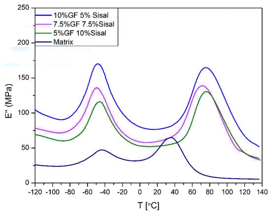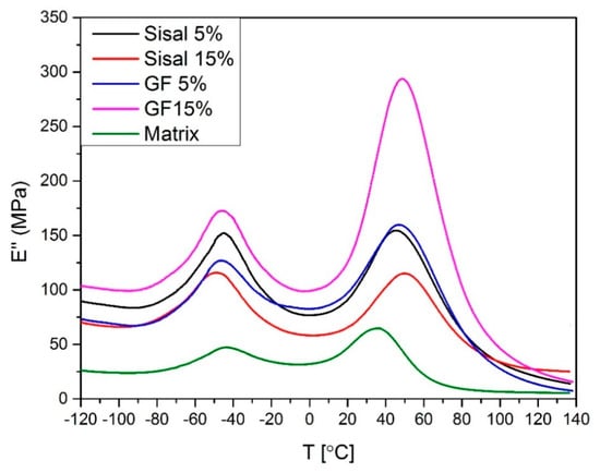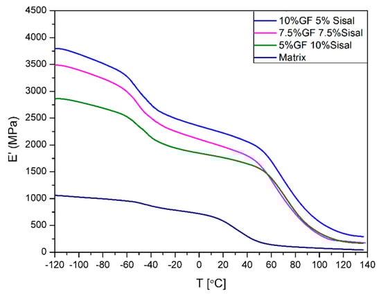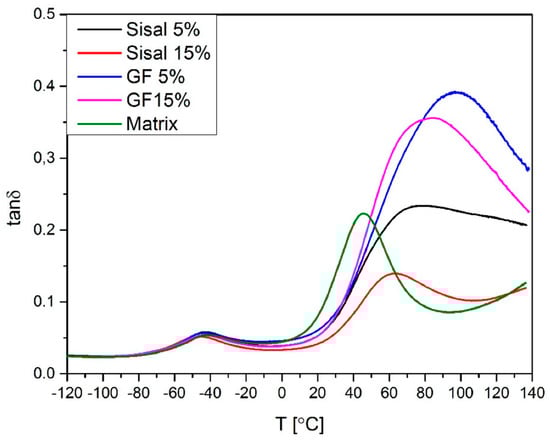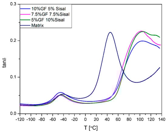 The variation of the storage modulus (E’) is shown in Figure 8 and Figure 9. DMA was performed to examine how the exposition of the hybrid composites to elevated temperatures would affect the properties of the composites. The change of the storage modulus occurs with the type and amount of fillers. It was found that the addition of both fillers increased the modulus in a wide range of temperatures. Values of the storage modulus have increased from 584 MPa for matrix to, respectively, 2369 MPa and 2222 MPa for 15%GF and 10%GF5%SISAL. In contrast to sisal, it was observed that samples with a higher content of glass fiber have a higher storage modulus. Samples of hybrid composites have properties between 15%GF and 15%SISAL and the storage modulus decreases with a lower amount of glass fiber. Furthermore, in higher temperatures (T > 60 °C), composites with sisal fiber have higher value of E’. It can be due to bonding and interactions between sisal fiber and polymer matrices. If the bonding between polymer matrix and fiber is stronger and the fiber modulus is higher, the increase of E’ can be observed. In the literature it is described that the modulus in a glassy state results from the intermolecular forces between atoms and the internal structure of polymer. That explains the reinforcing effect of using fibers, which allows the transfer of stress to the fiber [,].