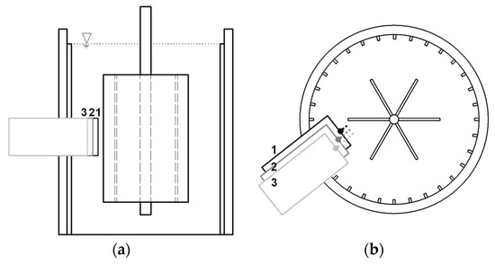 Figure 2. Scheme of the FBRM probe integrated into the rheometer at three different radial positions (the distance of each position from the middle point until the tips of the vane probe is shown as dash lines), each with an angle of 45° between the probe window and the flow direction; (a) vertical cut, (b) top view.