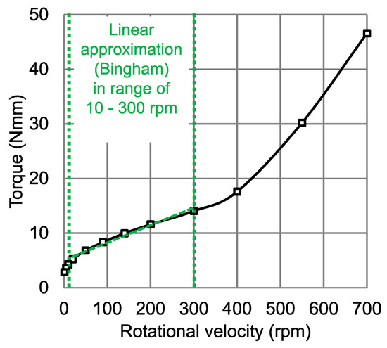 Figure 4. Typical results for torque as a function of rotational velocity, representative for all samples investigated with the Bingham approximation in the range of 10–300 rpm with regression coefficient (R2 = 0.998).