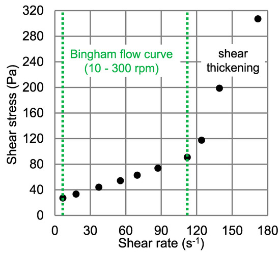 Figure 5 shows the flow curve of the cement paste obtained by the analytical calculations based on the equations explained in Section 2.5. As can be seen, the cement paste investigated here exhibits at least two different rheological behaviors in different ranges of shear rate, i) a linear region (Bingham model in the range of 7–112 s−1) and ii) a shear thickening region (>112 s−1). In addition, a shear-thinning behavior of the cement paste may be observed at very low rotational velocities (<10 rpm). However, it should be mentioned that the lower region may not precisely represent shear thinning, only, as it can also be an artifact from a decreasing plug flow radius with decreasing rotational velocity, i.e., decreasing shear rate [24].
