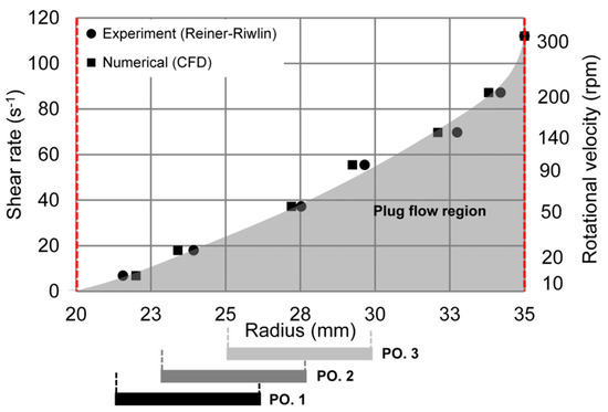 The plug flow radii at each rotational velocity determined by CFD simulations are in very good agreement with the radii calculated by the analytical model. As shown in Figure 6, by decreasing the average shear rate at the vane probe, the plug flow radius shifts from the outer wall to the inner vane probe. The plug flow region of the cement paste investigated here as a function of average shear rates is highlighted with grey color. According to Figure 6, at 300 rpm, there is no plug flow in the outer radius of the gap. In other words, the entire material inside the shear gap is sheared (fully sheared condition). Hence, the minimum shear rate of 112 s-1 is needed for fully sheared conditions for the cement paste investigated.