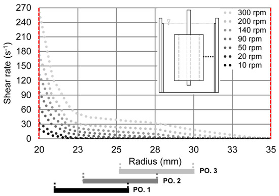 However, in the context of the FBRM measurements, it is important to evaluate a possible plug flow radius at the position of the FBRM probe. When the plug flow radius arrives at the laser rotation diameter of the FBRM system, the fluctuations of the data detected by the FBRM probe are significantly increased. Thus, in our experiments, the chord length distributions detected by FBRM were only evaluated for rotational velocities higher than 140 rpm (70 s−1), as the plug flow radius at these shear rates does not reach the range of the laser rotation of the FBRM probe at any position.
