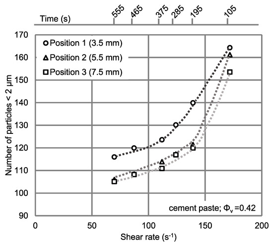 As expected, the number of small particles at radial position 1 is about 10% higher compared to the two other radial positions. As shown in Figure 9, the number of particles < 2 μm is reduced by about 31% in all radial positions when the average shear rate is decreased from 172 s−1 to 70 s−1. Moreover, the number of small particles is higher in position 1 compared to the two other positions because of the high local shear rates near the vane probe, showing disagglomeration and SIPM within the shear gap as a function of different shear rates.