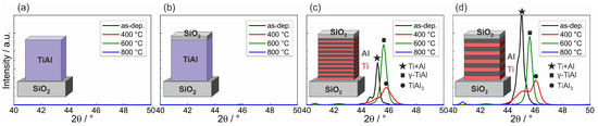 Figure 1 presents the results of the XRD measurements of the different samples in the as-prepared state and after annealing at 400, 600, and 800 °C in HV. It can be seen that for both co-sputtered films no peaks were visible for all sample states (Figure 1a,b). In contrast to this, clear XRD peaks were present for the ML films. In the as-prepared state, a superposition of the Ti (002, theoretical peak position: 2) and Al (111, theoretical peak position: 2) appeared (Figure 1c,d). The measured peaks were slightly shifted with respect to the theoretical position, which might be due to stresses in the thin films. Annealing at 400 °C led to a decrease of the peak intensities. However, there was still a superposition of two XRD peaks.