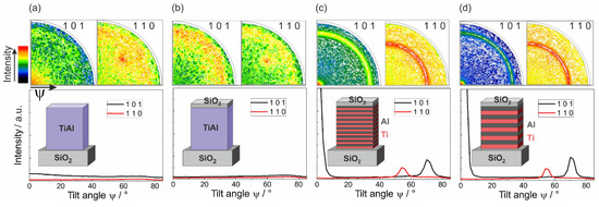 Results of the texture measurements of: (a) a co-sputtered Ti-Al film; (b) a co-sputtered Ti-Al film with SiO cover layer; (c) a ML Ti/Al film with 10 nm individual layer thickness; and (d) a ML Ti/Al film with 20 nm individual layer thickness, both with SiO cover layer, after annealing at 600 °C. The graphs represent the azimuthally averaged intensity versus the tilt angle .