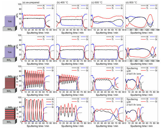 Results of the AES measurements of the co-sputtered Ti-Al film, co-sputtered Ti-Al film with SiO cover layer, ML Ti/Al film with 10 nm and 20 nm individual layer thickness, both with SiO cover layer in: (a) the as-prepared state; (b) after annealing at 400 C; (c) after annealing at 600 °C; and (d) after annealing at 800 °C. In (d), the gray contrast of the abscissa in the figures of the alloy samples points out the longer sputtering time as compared to the other graphs. In contrast to this, the sputtering of the ML samples was performed with a higher sputtering energy (2 keV instead of 1 keV), which resulted in a shorter total sputtering time.
