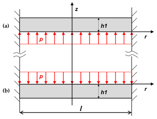 where h is the thickness of the plate. Subsequently, when a pressure p is applied to the incision plane, the cavity is increased. In Figure 2a, the equivalent system 1 is shown, this means two flat plates with h1 in thickness, fixed along the border and loaded with a uniformly distributed force p.