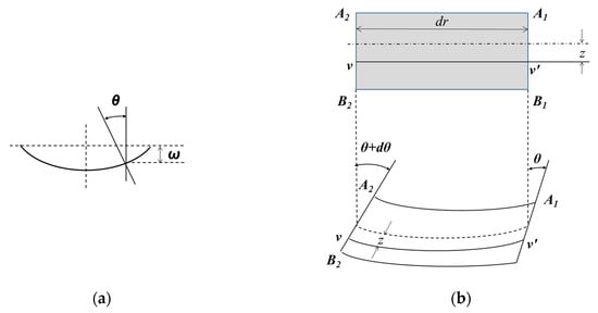 The negative sign is due to the bending direction as shown in Figure 3a, with the decrement of ω, θ increases. Now, if we consider radial sections along the plate before and after the load is applied, it is noted that as a result of the plate deflection, the A1B1 normal, rotate a θ angle, and the A2B2 normal rotate at a θ + dθ angle, as shown in Figure 3b.