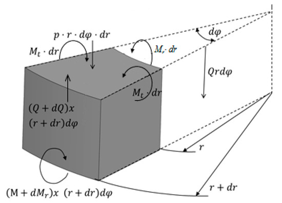 where D is the bending toughness of the plate. The balance equation of the selected element of the plate can be obtained by projecting the force along the Z axis and adding all the momentums with respect to the Y axis, which is tangent to the arc of radius r in the center of the plane, we obtain: