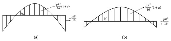 The integration constants C1 and C2, are determined from the boundary conditions for each specific case. Equation (6) is used to determine the radial function of the deflection, and using Equation (12), the momentum diagrams can be obtained according to Equations (14) and (15). From Equations (10), (11), and (18), the functions and are: