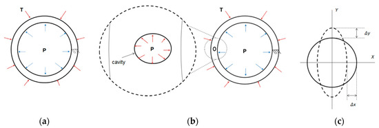 Changes in tube thickness for each case, in (a) tube without cavity, (b) tube with cavity and with pressure in pc and pt, and (c) tube with cavity, pressure in pc and pt is eliminated.