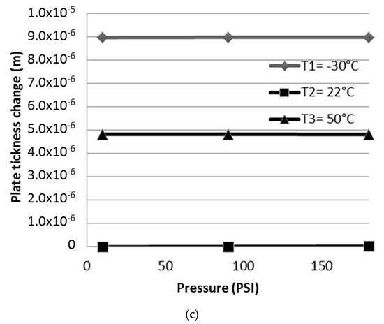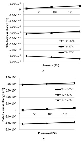 The selection of the cases comes from the fact that in real operation, tubes are subjected to a series of complex conditions like external temperature changes depending on the geographic location. With respect to the pressure changes, they were considered because of the flow rate variations caused for example during maintenance operations. Many other real conditions like tube inclination, friction loss, internal liquid reactions, etc., are no considered in this study. As a result, Figure 10 shows the plate thickness changes with maximum values found at T1 = −30 °C.