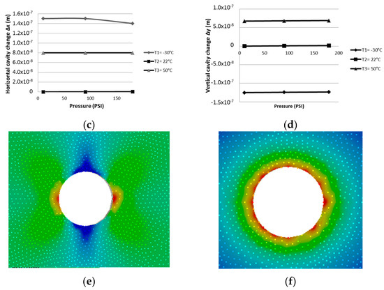 The cavity inside the plate subjected to different temperatures and pressures, suffers dimension changes which are shown in Figure 11a,b. Δx and Δy obtained with the presence of pc and pt. Figure 11c,d, shows the resulting Δx and Δy obtained when pt is eliminated. With respect to the stress distribution, the presence of the pressure inside the tube creates a difference around the cavity as shown in Figure 11e. The maximum stress levels are located on the horizontal sides and the magnitude depends on the applied pressure. Figure 11f, shows the stress distribution around the cavity without the pressure inside the tube.