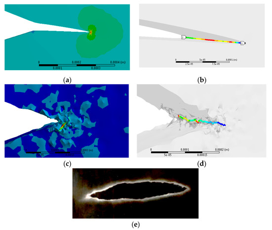 (a) Stress distribution around the tip of the crack in case 2a; (b) the horizontal line along the tip of the crack in case 2a; (c) Stress distribution around the tip of the crack in case 2b; (d) the erratic line along the tip of the crack created in case 2b and; (e) example of an evolved cavity observed in a HTVEM at ×50,000 in a molybdenum single crystal.