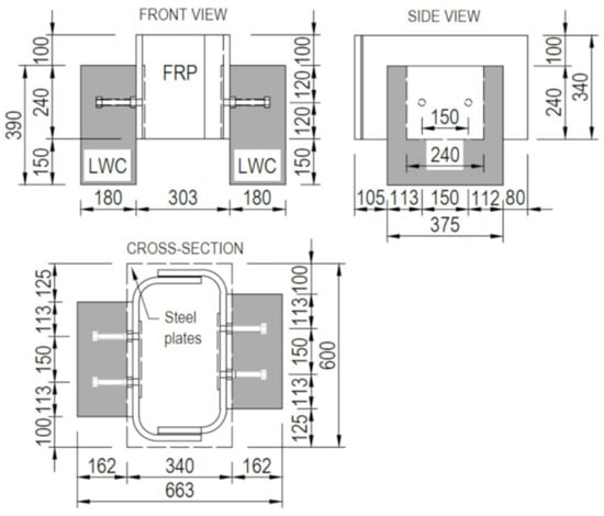 The 180 mm thick slab was made of 35/38 class LWC based on the lytag type aggregate with density ρ = 1968 kg/m3. The slab was reinforced longitudinally and transversally with two grids made of 12 mm ribbed GFRP rebars spaced every 120 mm in each direction. The LWC slab was connected to FRP beam by means of novel shear connectors made of M20 class 4.8 bolts welded to a rectangular steel plate (Figure 2). The single connector consisted of 8 bolts welded in two rows to 10 mm thick steel plate of 240 × 660 mm in plan. The connectors were attached to bottom surface of beam’s top flanges with epoxy adhesive.