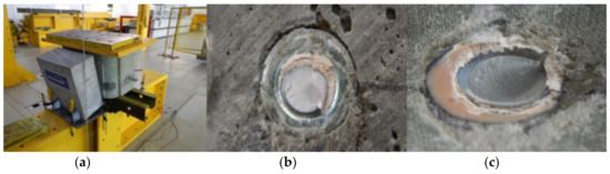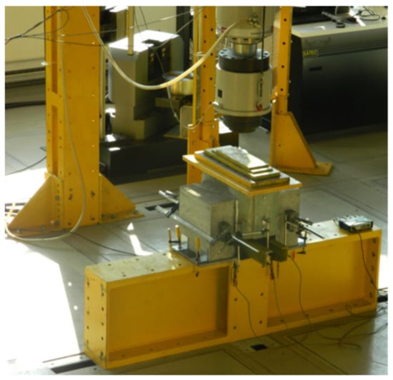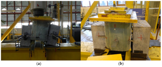 The specimens were tested in the universal test machine Schenck with 630-kN capacity. During the static tests, the rotation of the two lateral LWC blocks was prevented. Load was applied to the specimens by a hydraulic actuator. To prevent local failure of laminates the load was applied to the specimens through a set of steel plates placed on the laminates by epoxy layer (Figure 5). The loading sequence of each specimen was as follows: five cycles of loading up to characteristic load level of PEd,k = 87.92 kN, subsequently five cycles of loading up to design load level of PEd,d = 125.36 kN, and finally loading up to specimen’s failure. The both intermediate load levels were determined taking into account the maximum shear force per stud (Table 1) multiplied by four studs of the specimen. The loading rate was 2.0 kN/s.