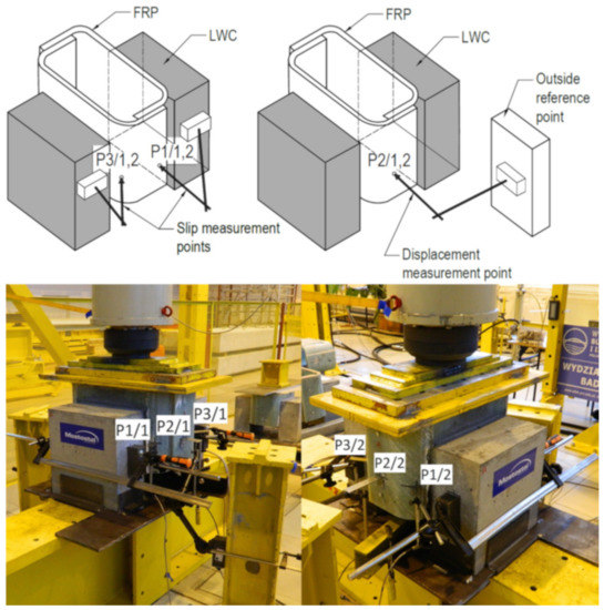 Four linear variable differential transducers (LVDTs) were installed to measure the relative slip between the GFRP and the concrete. Figure 6 shows the location of these LVDTs on the specimen (measurement points P1/1, P1/2, P3/1 and P3/2). Additionally, two LVDTs were installed to check the loading conditions and displacement of the specimen’s center (measurement points P2/1 and P2/2). The HBM Spider Quantum X acquisition system was used to record the measurement data with 2 Hz frequency.