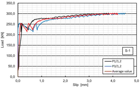 The basic outcome of the push-out test is a load-relative slip curve. This plot (typically average of all slip measurements) enables us to determine the first slip load Ps and corresponding slip value δ1, both necessary for slip modulus kslip estimation. Ultimate load Pu and corresponding ultimate slip δu let us to determine shear connecting capacity. The failure mode indicates the weakest elements of the connection. All of these outcomes are described and illustrated below for all specimens tested.