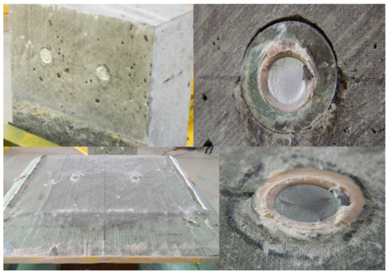 In specimen S2, the loading phenomenon was very similar to that in S1, initial cracking sound was heard, and the first slip occurred at approximately 245 kN and the ultimate load was 315 kN. The bolts on one side suddenly fractured, while bolts on the other side did not fail. Concrete cracking and bearing or shear-out failure of the laminate were not observed on the respective surfaces of the specimen S2. However, two times bigger first slip value of 0.30 mm was observed in this case, due to premature slip of 0.065 mm that occurred at about 160 kN (Figure 10). This is probably attributed to the worse GFRP surface condition and induced that the bolts gradually slipped into a bearing region around the holes in the GFRP (Figure 11).