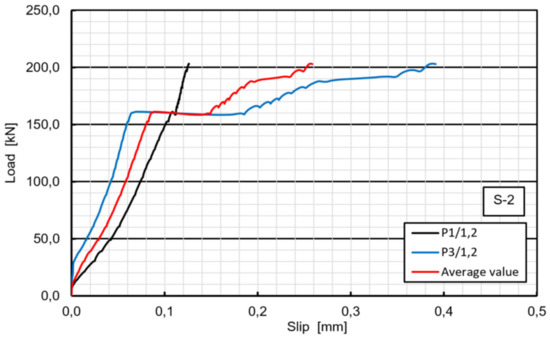 The outcome of kslip for the novel connector is listed in Table 4. For specimen 2 in parenthesis kslip value is also given after deducting the premature slip 0.065 mm (Figure 10), which was rather untypical behavior of the specimen. The average slip modulus kslip is approximately 523 kN/mm, indicating that the connectors can promote the composite action very efficiently, than other solutions, where kslip was obtained in the range of –200 kN/mm [25,29,35].