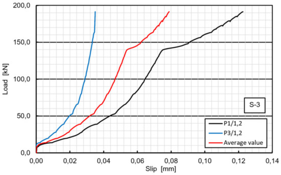 Load–slip curves of specimen S3 in the range of 0–200 kN: premature slip at 140 kN (one side only).