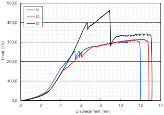 The push-out experiment demonstrated that there were no significant differences between the behaviors of three specimens S1–S3 except concrete protrusion effect in specimen S3. The load–displacement curves of three specimens were almost parallel up to first slip (debonding), resulting in a similar stiffness of three specimens (Figure 14). (Note: the initial displacement in the range of 0–50 kN is due to steel package load adjustment). After two slips attributed to two slip planes of specimens, the load was transferred to the slabs solely by bolts. The behavior after debonding was always nonlinear up to the failure, attributed to yielding of bolts. Specimens finally failed due to pure shear fracture of bolts and no cracking, bearing or shear-out failure around the holes of the GFRP and concrete were observed. The results showed that the capacity of the bolts were sufficient to provide reverse strength after debonding and therefore the specimens did not fail immediately after debonding. The main quantitative outcomes of the push-out tests are provided in Table 3. As can be seen in this table the ultimate failure force was between 311–342 kN with a maximum difference of a 9.9%.