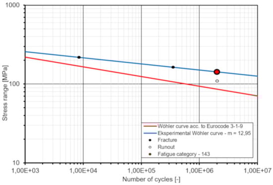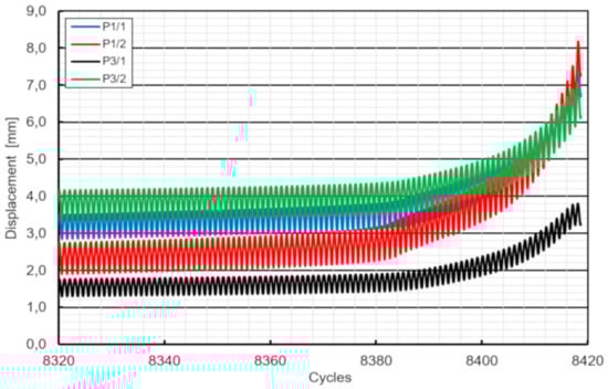 During the cycling tests, the displacement range of the specimens was recorded while keeping the load range constant. The displacement was increasing rapidly due to crack initiation at the welding region as shown in Figure 15. Numbers of cycles at crack initiation and at failure are summarized in Table 6.
