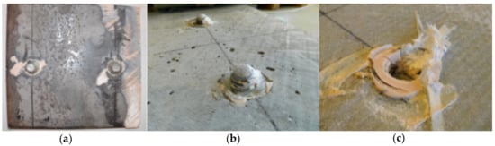 Fatigue failure mode of specimen F4: (a) fracture at weld toe on steel plate; (b) fractured bolt shanks; (c) slight shear-out failure in GFRP laminate.