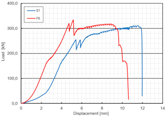 Since the specimen F6 did not fail after 2 million cycles of loading, the fatigue test was stopped and the specimen was loaded statically in the same way as specimens S1–S3 to evaluate possible reduction of the static strength of the shear connection subjected to fatigue loading. The specimen F6 exhibited no slip until the load of 320 kN was reached (Table 4). Similar to specimen S3 the load applied was transferred initially by the concrete surface protrusion. The protrusion was crushed at 365 kN, the load rapidly decreased, and the specimen started to transfer the load only by bolts. The bolts suddenly fractured at the ultimate load of 315 kN, what was similar ultimate value as for specimens S1 and S2. Failure mode was similar as well. Hence no reduction of the static strength of the shear connection was revealed when subjected to cyclic loading (Figure 17).