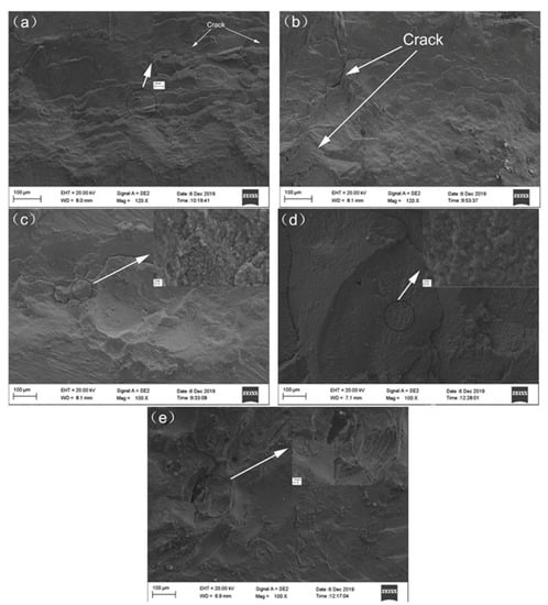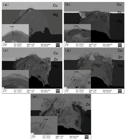 The welded joints with Zn interlayers of different thicknesses are shown in Figure 2. The magnesium alloy evaporated obviously in the welding process because of the lower boiling point of magnesium (1107 °C), and there was no filler material during the welding, which resulted in the serious concave of the welding joint. Figure 2a,b reveals cracks on the top of the joint, and the cracks in Figure 2d,e were large and long. Figure 2c shows the joint with a 0.1 mm thick Zn interlayer and does not show any cracks and other defects. The elements in the joint were evenly distributed in the joint, and diffusion was relatively uniform.