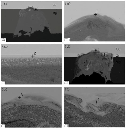 Figure 3 shows the areas from which EDX spectra were acquired. Figure 3a–c shows the Mg/Cu joints without an interlayer. Figure 3b is the high-magnification image of area b in Figure 3a, and a small number of cracks could be found. Figure 3c exhibits the high-magnification image of area c in Figure 3a, revealing a smooth intermetallic compound (IMC) layer. Figure 3d–f shows the welded joint with the 0.1 mm thick Zn interlayer. Figure 3e shows the magnified image of area e in Figure 3d, and the joint was fused uniformly without cracks. Figure 3f is the high magnification image of the area f shown in Figure 3d. It could be seen that there was not an obvious smooth IMC layer, and the elements were fully fused.